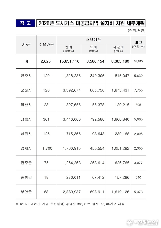 한편, 전북특별자치도는 2017년부터 해당 사업을 추진해 현재까지 총 318km의 공급관을 설치하고 1만 5천여 가구에 도시가스를 공급하는 성과를 거두고 있다.