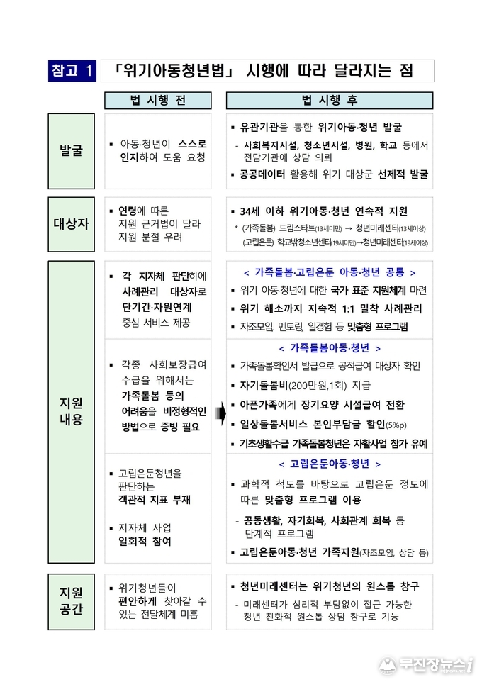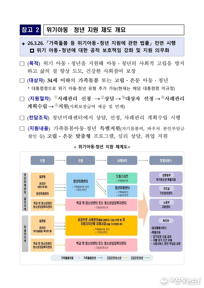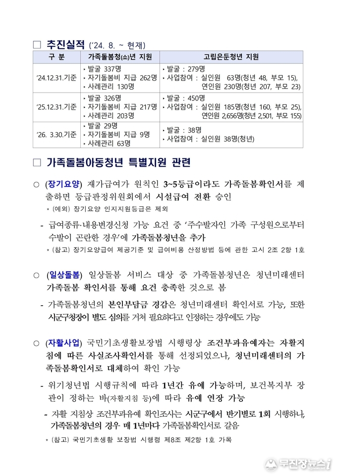 이번 조치는 지난 3월 26일 시행된 「가족돌봄 등 위기아동·청년 지원에 관한 법률」에 따른 것으로, 전북은 이미 ‘24. 8월부터 추진해 온 ‘청년미래센터’ 시범사업의 노하우를 결합해 가장 촘촘한 안전망을 구축한다는 계획이다.