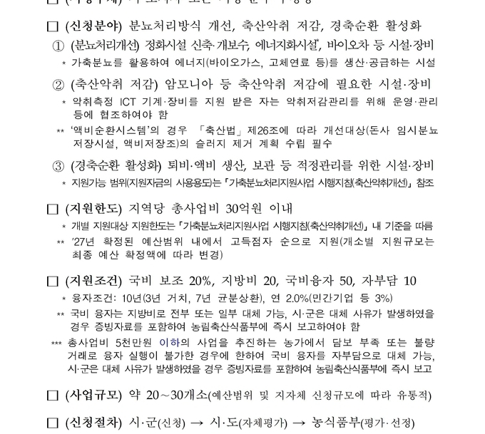 사업은 ▲분뇨처리방식 개선 ▲축산악취 저감 ▲경축순환 활성화 등 3개 분야로 추진되며, 전국 20~30개소 규모로 시·군 단위 공모를 통해 대상지를 선정할 예정이다. 시·군은 지역 여건과 농가 수요를 반영해 총사업비 30억 원 이내에서 사업계획을 수립·신청할 수 있다.