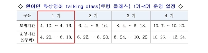 올해 원어민 화상영어 토킹 클래스는 총 4기로 구성, 1기수당 9주씩 수업이 진행될 예정이다.