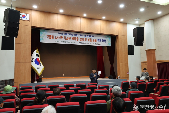 무주군은 지난 8일 농업기술센터 농민의 집에서 “2026년 사과 병해충 예찰·방제 사업 설명회”를 가졌다.