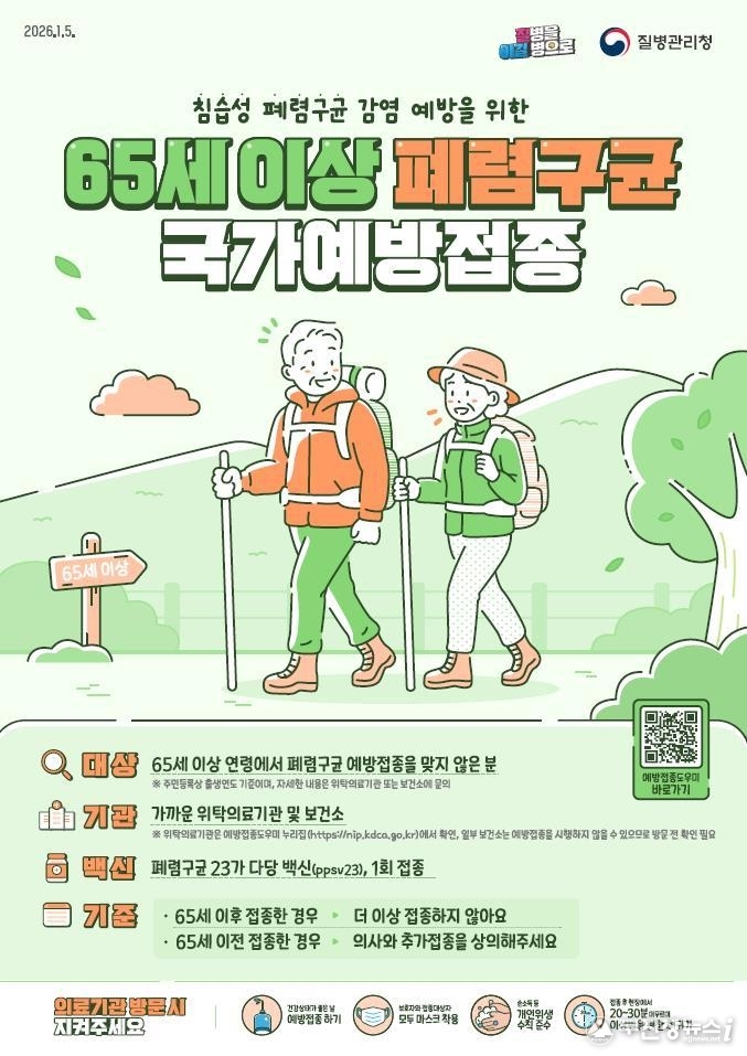 올해 예방접종 대상은 주민등록번호 기준 1961년 12월 31일 이전 출생자로 폐렴구균 접종 이력이 없는 65세 이상 어르신이며 전국 지정 위탁의료기관에서 주소지와 관계없이 무료로 접종 가능하다. 단, 이미 65세 이후 해당 백신의 접종을 완료한 자는 추가 접종을 하지 않아도 된다.