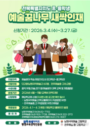 전북특별자치도평생교육장학진흥원(원장 이현웅)은 오는 3월 4일부터 3월 27일까지 ‘2026년도 예술꿈나무 새싹인재 육성사업’ 참가자 122명을 모집한다고 밝혔다. 지난 2022년부터 지속적으로 추진되어 온‘예술꿈나무 새싹인재 육성사업’은 예술적 잠재력이 있는 청소년들에게 양질의 전문 교육과 체험 기회를 제공하는 사업이다. 특히 올해는 기존 전주예술중학교와 남원국악예술고등학교에 더해 전주예술고등학교가 교육 운영 기관으로 추가 참여하며 교육의 전문성과 연속성을 한층 높였다. 올해 모집 인원은 총 122명으로, 전주예술중·고등학교에서 62명, 남원국악예술고등학교에서 60명을 각각 선발한다. 선발된 학생들은 오는 4월부터 9개월간 주말 시간을 활용해 음악, 미술, 무용, 연기 등 전공별 전문 교습을 받게 된다 신청을 희망하는 학생은 3월 4일부터 3월 27일 사이에 본인이 관심 있는 과목을 선택하여 해당 학교에 신청서를 제출하면 된다 진흥원 이현웅 원장은 “2022년 시작된 이사업은 예술분야에 재능 있는 학생이 사교육 없이도 예술학교 등에 진학할 수 있도록 돕는사다리 역할을 해왔다”며, “도내 학생들과 학부모님들의 많은 관심과 참여를 부탁드린다”고 밝혔다 <