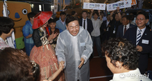 12일 고창 공설운동장에서 열린 제62회 전북특별자치도민체육대회 개회식에 김관영 도지사와 문승우 도의장, 유승민 대한체육회장, 심덕섭 고창군수, 정강선 전북체육회장을 비롯한 참석자들이 선수단에게 손을 흔들며 인사하고 있다.