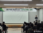 진안군이 제9회 전국동시지방선거를 앞두고 공무원의 정치적 중립성과 공정성강화에 나섰다. 진안군은 6일 군청 강당에서 전 직원을 대상으로 공직선거법 교육을 진행했다. 백성하 진안군선거관리위원회 사무과장이 강사로 나선 이날 교육에는 군청 직원 200여 명이 참석했다. 강당을 찾지 못한 실과‧읍면 직원 300여 명은 청내 방송을 통해 교육을 시청했다. 이번 교육은 지방선거를 90여일 앞둔 시점에서 자칫 발생할 수 있는 위법 소지를 사전에 차단하고 공정한 선거 분위기를 만들기 위해 마련했다. 백성하 사무과장은 공무원의 선거 중립 의무와 공직선거법상 제한‧금지 규정 등을 실제 사례와 함께 설명했다. 특히 최근 빈번하게 발생하는 SNS 활동 위반 사례를 중심으로 공무원들이 주의해야 할 구체적인 사례를 안내하고, 질의응답을 통해 직원들의 궁금증을 해소하는 시간을 가졌다. 진안군 관계자는 “공무원은 선거에 개입하거나 오해를 살 수 있는 행동을 절대 해서는 안된다”며 “교육과 지속적인 공직선거법 안내를 통해 전 직원이 경각심을 갖고 업무에 임할 수 있도록 하겠다”고 말했다.