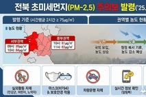 전북특별자치도 보건환경연구원은 25일 오전 전북 서부권과 중부권에 국외 오염물질 유입의 영향으로 초미세먼지(PM-2.5) 농도가 높아지며 초미세먼지 주의보를 발령했다고 밝혔다. 초미세먼지(PM-2.5) 주의보는 시간 평균 농도가 2시간 이상 75㎍/㎥을 넘길 때 발령된다. 이날 서부권역은 오전 9시 99㎍/㎥, 10시 84㎍/㎥, 중부권역은 오전 10시 81㎍/㎥, 11시 83㎍/㎥를 기록하며 기준치를 초과했다. 이번 주의보는 중부와 남서부 지역을 중심으로 오전까지 국외 미세먼지가 유입되면서 발령된 것으로 분석된다. 오후부터는 북서쪽에서 비교적 청정한 기류가 유입되며 농도가 점차 낮아질 것으로 예상된다. 전경식 보건환경연구원장은 “공기 중 초미세먼지와 미세먼지 농도가 높아지면 어린이와 노약자, 호흡기·심장 질환자 등 민감군은 물론 일반인도 가급적 실외활동을 자제해야 한다”며 “부득이하게 외출해야 할 경우에는 마스크와 보호안경 등을 착용하고, 대기오염 저감을 위해 차량운행도 가급적 줄여 달라”고 당부했다. 아울러“전북특별자치도 실시간대기정보시스템(http://air.jeonbuk.go.kr)을 통해 대기환경정보 확인과 예․경보 상황을 알림톡 등으로 받아볼 수