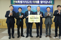 전북특별자치도는 2일 도청에서 대한적십자사 전북지사에 2026년도 적십자 특별회비 500만 원을 전달했다. 이번 전달식은 2026년도 적십자 모금 개시를 알리는 제1호 특별회비 전달식으로 진행됐으며, 김관영 도지사가 직접 특별회비를 전했다. 전달식에는 대한적십자사 전북지사 김홍식 회장과 임직원이 참석해 지역사회 나눔 실천의 의미를 함께했다. 전북도는 매년 적십자 특별회비를 기탁하며 도민 참여 확산과 기부문화 정착에 앞장서고 있다. 적십자 특별회비는 지역 취약계층 긴급지원, 재난 대비 및 구조 활동, 헌혈 활성화, 안전교육 등 다양한 인도주의 사업에 활용된다. 특히 기후변화로 인한 자연재해 증가와 복지 사각지대 확대 속에서 적십자 활동의 중요성이 더욱 강조되고 있다. 내년도 대한적십자사 전북지사의 적십자회비 모금 목표는 12억 4천만 원이며, 2026년 1월 31일까지 집중 모금기간을 운영하고 있다. 김관영 도지사는 “적십자 특별회비는 어려운 이웃을 돕고 재난 상황에서 생명을 지키는 데 중요한 역할을 한다”며 “전북도는 앞으로도 도민들과 함께 지역 공동체를 위한 나눔 실천에 적극 동참하겠다”고 말했다. 김홍식 전북지사 회장은 “전북도가 매년 가장 먼저 나눔을