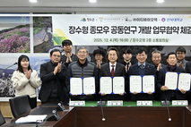 장수군은 장수한우지방공사, 이티바이오텍(주), 전북대학교와 장수군청 회의실에서 장수한우 품질 고급화를 위한 ‘장수형 저탄소 종모우 개발’ 공동연구 상호협력 업무협약(MOU)을 체결했다고 11일 밝혔다. 이번 협약은 협약기관 간 상호 업무협조 체계를 구축해 장수 한우 산업의 경쟁력을 높이기 위한 장수 지역 사양환경에 적합한 우수 유전자원을 확보하고, 탄소배출을 줄이면서도 생산성과 품질을 높일 수 있는 종모우 개발을 위해 마련됐다. 특히 종모우 개발을 통해 장수 한우 고유의 유전형질을 확립하고 탄소배출 저감과 생산성 향상을 동시에 달성하는 것이 핵심 목표다. 협약에 따라 군은 저탄소 종모우 개발을 위한 사업 총괄 및 행·재정적 지원을 하고 장수한우지방공사는 채정·가공·사양관리와 농가 컨설팅에 나선다. 또한 이티바이오텍은 유전체 기반 연구개발을 진행하고 전북대학교는 유전 능력 평가와 우량 암소·후보 종모우 선발을 각각 담당한다. 장수군은 이번 공동연구를 최근 지정된 전북특별자치도 농생명산업지구 내 ‘저탄소한우 산업지구’ 조성사업과 연계해 2030년까지 단계적으로 추진할 계획이다. 협약에 따라 개발된 종모우에서 생산된 정액은 지역 한우농가에 우선 공급해 현장 적용성