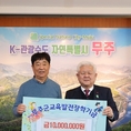 (유)케이디엔텍 송기대 대표(전북기계공업협동조합 이사장)가 지난 26일 무주군에 고향사랑기부금 1천만 원을 기탁했다. 송 대표는 “무주발전에 동참하고 있는 기업으로서 누구보다 자연특별시 무주를 응원하며, 무주군민의 행복을 기원한다”라며 “오늘의 고향사랑 기부가 무주의 내일을 기대하게 하는 동력이 되기를 바란다”라고 전했다. 김제시 소재지에 있는 (유)케이디엔택은 상하수도와 폐수, 정수 처리 기기와 환경기계, 산업기계 등을 제작·설치하는 전문 기업이다. 무주군에는 2023년부터 올해까지 3년간 총 2천만 원의 고향사랑기부금을 기탁하며 무주사랑을 실천하고 있다. //